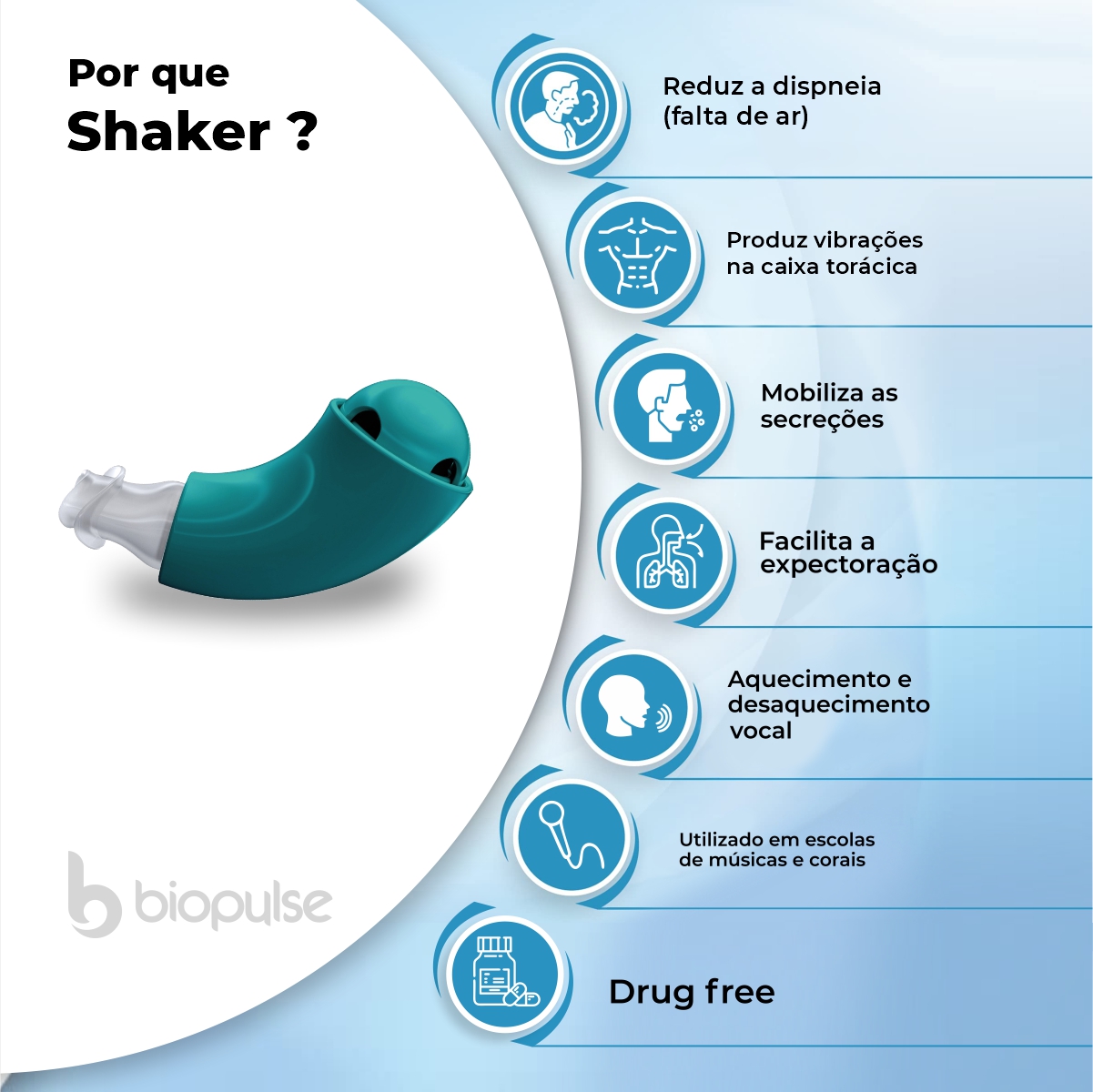 SHAKER é um exercitador respiratório e incentivador da higiene brônquica de oscilação oral de alta frequência. É empregado na fisioterapia visando facilitar a expectoração e combater o acúmulo de secreções prevenindo infecções bronco-pulmonares e restabelecendo as funções pulmonares. Sua linha é composta pelos modelos: CLASSIC, CLASSIC LIGHT, CLASSIC KIDS, NEW, NEW LIGHT E MEDIC PLUS. Os benefícios de todos os modelos são semelhantes e suas diferenças visam atender as individualidades do usuário em relação à carga mínima do exercício, conforto em relação à ergonomia e bocal, bem como em seus objetivos de intensidade.