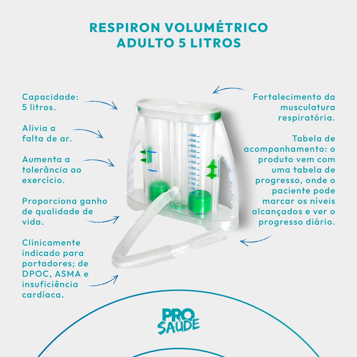 O Respiron Volumétrico é especialmente indicado para indivíduos que apresentam quadros de dificuldades respiratórias, deficiência dos músculos respiratórios, atelectasias, bem como nos casos de pré e pós operatório, para prevenção e combate de doenças respiratórias. Equipamento de uso individual, projetado para promover a melhora de seu desempenho respiratório.