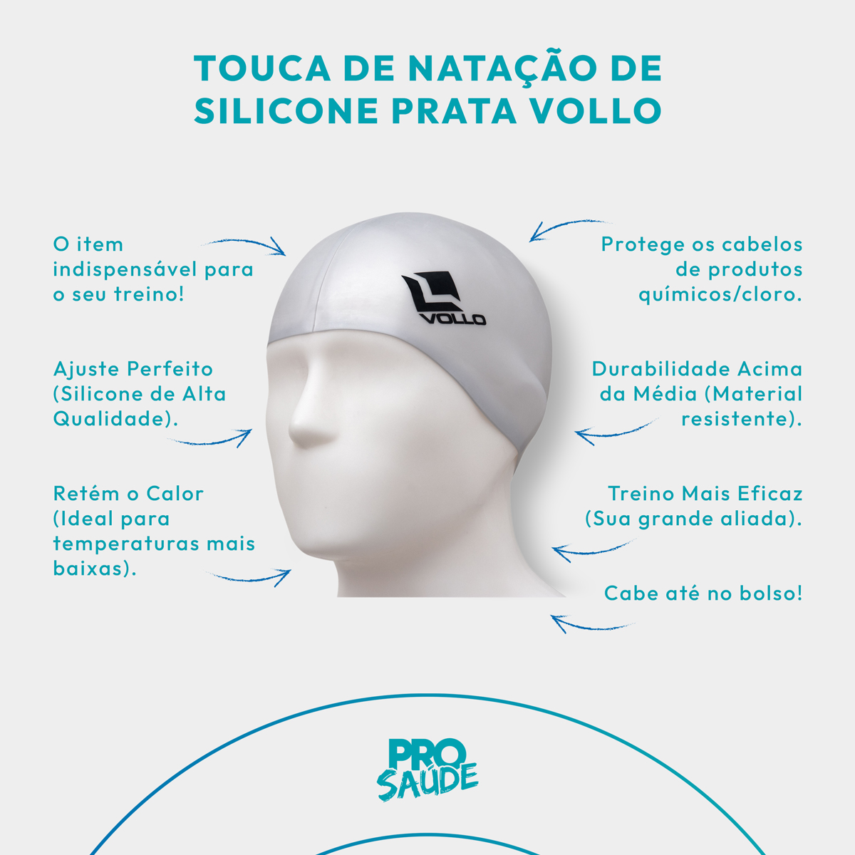 A Touca de Natação Prata Vollo é aquele item indispensável para os atletas ou praticantes da natação que não abrem mão de conforto e segurança.